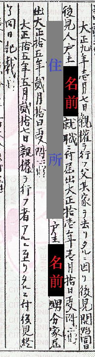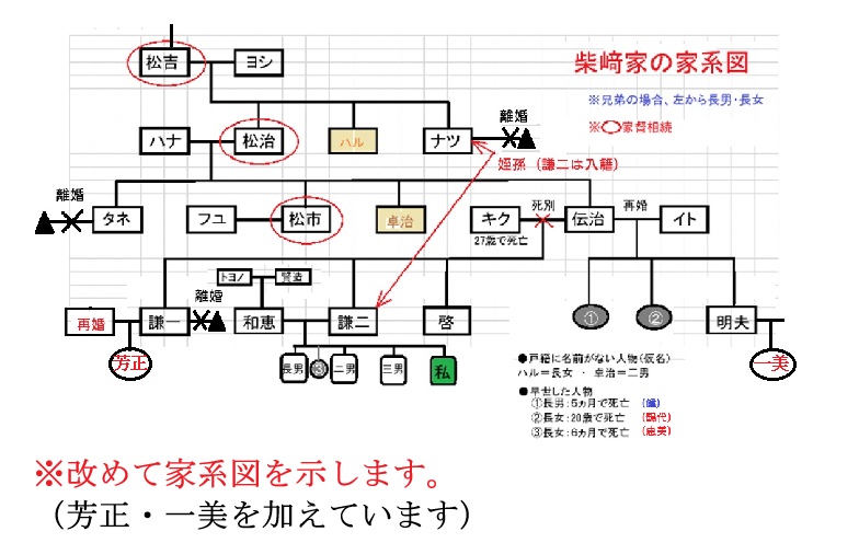 | ④「柴﨑キクの死亡」 ●柴﨑キクの死亡 伝治の妻が二十七歳の若さで死亡したのです。死亡原因は語られていませんが、最近では聞かない言葉ですが、「産後の肥立ちが悪かった」のかもしれません。 夫の伝治は、三十一歳、五歳・四歳・二歳の子供を残しての死亡は柴﨑家の運命を大きく変えてしまったと言えます。 幼い三人の子供は、同居していた松市の妻、フユと祖母に当たるハナが面倒を見ていたことは想像に難くありません。 家系を語るとき、血縁としての家系図が中心となります。しかし、戸籍謄本などは、養子縁組など、取り婿取り嫁などと言われて、系図の中に他人が入り込む余地もあります。さらに、何処に住んでいたかも重要な要素と言えます。家族なら同じ場所に住んでいたと言える訳ではありません。 家族同然に暮らしていたが、それが、一般的に言える両親と子供達の核家族、少し拡げても祖父母・両親・子供達、2世帯程度の同居ならまだ説明も簡単ですが、それ以外にもいろいろ考えられます。 それらのことを説明しながら追々、話していきますが、柴﨑キクの死亡で激変する柴﨑家は、新たな事態を迎えるのです。 ここで戸籍謄本の記述の一部を紹介します。 この記述では、謙一の弟達(謙二・啓)の後見は確認できません。 おそらく、この戸籍謄本が謙一のものだからでしょう。 伝治は、子供達を残して何処に行ったのでしょうか?。 当時の分家は、戸主である松市の承諾なしでは実現しません。この分家には奇妙な事実がもう一つあります。出て行ったとは言え、伝治が分家した場所は、以前の住まいの場所と同じでした。松市が家督相続した場所です。その場所は、住居表示が○○番屋敷と呼ばれた古い呼称から「●●●●●番地」となり、現在でも使用されている住居表示です。 ●●●●●は、住所です。 それでは、「甥分家届」とある、次項目を読み解かねばなりません。 戸主■■■■甥とは、謙一のことです 分家は名目上と言えます。それでも分家は行われました。しかも、後見人を松市が引き受けています。 引き受けたのでしょうか? 松市主導の分家劇であることは火を見るより明らかです。 ここまでの戸籍謄本に矛盾は無いように思えますが、強いて挙げれば、謙一の分家が松市の後見の最中に行われていることです。日付で言えば、大正十五年2月17日です。後見と分家の登記は可能なのか疑問の残るところです。 分家後10日で後見の終了ですが、このズレが気になるところです。 『戸籍謄本には、分家の記述は再三登場しますが、本家の記載はありません。「本家」とは分家に対応しただけの記述で、俗称と言えます』 松市は、なぜ分家を主導したのかを検証するには、時系列がヒントになります。 大正五年十一月二十四日、柴﨑キク死亡(伝治の妻)大正九年一月七日、伝治、柴﨑松市家から分家。 大正十年三月一日、「健」誕生。 (伝治、イト夫婦の長男/イトは後妻) 大正十年三月七日、柴﨑伝治と山田イトが結婚 (長男誕生と結婚が前後しているのは愛嬌) 大正十年八月十一日、「健」が死亡(五ヵ月) 大正十一年九月九日、柴﨑ナツが離婚。 (松市籍へ入籍/新住所) 大正十一年十月十五日、鶴代誕生 大正十二年三月九日、柴﨑ナツが松市籍から分家 大正十五年二月十日、柴﨑謙一が松市籍から分家 結婚から最初の子供が誕生するまでの期間について、「愛嬌」としましたが、当時の結婚が、妻に子供が出来た時、初めて結婚を認める、届け出ることが常態化していたとも思えます。柴﨑家や藤田家の戸籍謄本にそのことが散見されます。 柴﨑謙一が松市籍から分家したときは、柴﨑家は、松市家が本家で、伝治家・ナツ家・謙一家の分家戸籍が存在していました。ただし、ナツ家と謙一家は、一人だけの単独した戸籍でした。この時の戸籍と同居していた家族構成は正確には不明でした。 正確には不明の家族構成ですが、家屋は2ヶ所に分かれていたと考えられます。 時系列は、戸籍謄本から正確に再現できますが、同居などの生活実態を戸籍謄本からは読み取ることが出来ません。 前妻のキクが死亡してから約4年後、大正九年に、伝治は分家しています。戸籍謄本の記述では、「其の家を出ています」。さらに1年後、伝治は、再婚し、子供を授かっています。その経緯が愛嬌と書きましたが、「健」誕生の十月十日前には、伝治とイトは男女の仲だったのです。 伝治の分家は、伝治が男鰥(オトコヤモメ)になってから3年後です。 松市主導の不可解な分家劇は、その後の伝治の再婚を見据えたものと考えることもできますが、私は、別の考えを持ちました。 松市は、伝治を勘当同様に処分したのではと考えたのでした。有り体に言えば、育児放棄の状態になり、女に走った伝治を丸裸で一方的に分家して、放り出したと考えました。松市の立場ならそれが可能でした。伝治の三人の子供達を人質的に後見に取り、自ら後見人に就職したと考えたのでした。 反面、松市がこ