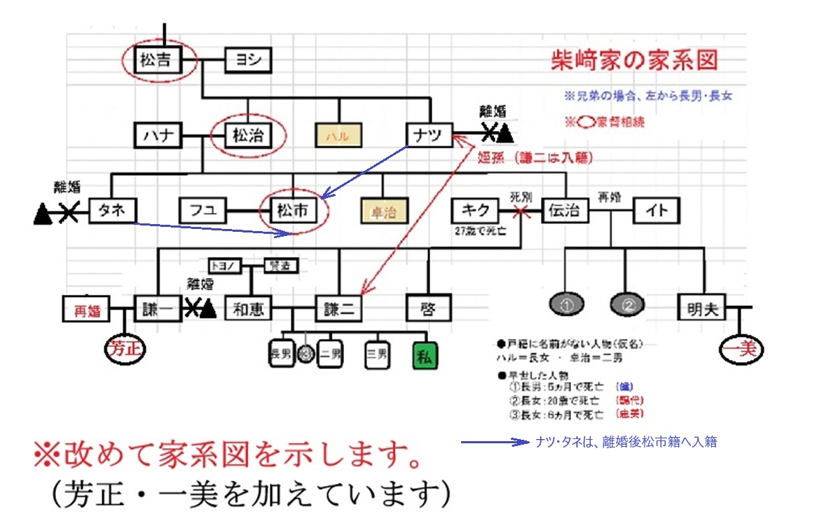 | ⑦「松市の決断と和恵の同居の意味」 松市は、後取りを作ることが出来ませんでした。 実子での後取りは勿論、養子での後取りも諦めました。 しかし、柴﨑家の戸主としての座は死守しました。 これは、私の結論的感想ですが、具体的に手はずを整えました。 経緯から、謙二を養子にと考えた節があります。 恐らく、伝治が反対したのでしょう。謙一の立場もあり松市は諦めたと思います。 しかし、松市夫婦には不安がつきまといます。夫婦には暮らしを伴にすべき家族が居ません。「本家」と呼ばれる大所帯で暮らしてはいても、頼れるべき人間が居ない不安定な状況でした。 正直肝心なところがハッキリしませんが、松市が隣地に家屋を建て移り住んだ時期は、出戻りのナツと松市夫婦という先の見えない状況だったと考えられます。 松市の決断は具体化されます。 再入籍したナツを分家して独立させます。六十歳を過ぎた出戻りの女に単独で戸籍を与えます。 ナツを分家独立させた3年後、謙一を分家独立させます。その後、謙二をナツ籍へ入籍させます。 一連の経過は、ナツが松市籍へ復籍後七年で完結します。 「本家」の継承は、実質、謙一に委ねられます。 松市夫婦は、後に夫婦になる、謙二と和恵夫婦が引き受けることになるのです。 松市は、戦後夫婦単位の戸籍になるまで、家督相続した戸籍上の戸主としての立場を守り通しますが、柴﨑家の家督は断絶したと言えます。 決断したとは言え、松市はもがくのでした。 和恵の同居です。 これには解明できない事情が、和恵の実家の藤田家にあったようです。 和恵が、柴﨑家に「奉公」に出されたとか、来たとか言われたようですが、それを聞いたのは、私が、柴﨑家の家系を調べ始めてからのことでした。 それも、兄嫁から聞いたのでした。結果として、実家を継いだ二男の嫁から聞いたのでした。 私は十八歳で実家を離れています。親子の生活は、たかだか十八年です。 それに比べ、兄嫁は結婚後三十年以上謙二・和恵夫婦と生活を共にしています。 子である私よりも和恵の事を知っていても不思議はありません。 和恵の奉公先が柴﨑家でも、「本家」ではなく、松市が隣地に住んでいた「部屋」と呼ばれる家に移ったのは考えるべき点です。 松市と伝治兄弟は、村上家姉妹を通じて、藤田家とも義兄弟の関係でした。松市家には、妻のフユが居て、藤田賢造の妻とは姉妹です。伝治の先妻キクは妹ですが、既に死亡していました。 和恵にとっては、松市の妻フユは、伯母に当たります。伯母夫婦の家に奉公に出されたと考えられます。 当然、松市と藤田賢造の話し合いだったと思われます。「奉公」の理由ですが、兄嫁からの伝聞ですが、和恵には姉がいて、当時として高等教育を受けていました。其の姉と同じ進路を考えていたようですが、藤田家の経済状況がそれを許さなくなり、松市宅から洋裁学校のような所へ通う条件だったようです。 藤田家は子沢山で、和恵の姉の頃までは比較的裕福だったようです。 口汚く言えば、口減らしだったのでしょうか? 松市は和恵を養女にでもと考えたような形跡があります。ただ、謙二と和恵の松市家へ同居時期が判然としない為、松市の考え方は分かりません。 戸籍謄本によれば謙二は、1926年(大正十五年)一旦兄の謙一籍へ入籍しています。 その後、柴﨑ナツ籍へ入籍しています。(1930年(昭和五年)) 謙二は、十八歳の時ですが、戸籍謄本が正しいとすれば、藤田和恵はまだ同居していません。 しかし、附票からは3ヵ月後からは同居が始まったことになります。和恵は十歳です。 和恵の尋常小学校卒業の経歴から決定的な矛盾と言えます。 尋常小学校の高等科を十四歳で卒業していますから、直後に、松市家に転居したとしては、転居の事情からしても必ずしも結婚を前提にした転居では無かったと思われます。 和恵は、十八歳で謙二と結婚しますが、二人には数年間の同居生活があったことは間違いないと思われます。 この経緯は両親から何も聞かされていない私としては、年頃の男女が自然な結びつきで結婚に至ったのではと考えました。 長男(私の兄)の誕生日が、戸籍上の結婚日の一月後なのです。実際は、松市と藤田賢造の間で何らかの目的があったのではと妄想するしかありません。 十八歳での結婚は、当時としても比較的早かったと思われます。比較の問題でしょうが、和恵の姉妹は二十歳程度で全て結婚しています。 この実録・家系図では直接触れませんが、和恵が結婚する二月前に姉が結婚、一月前には、母が亡くなっています。 ともかく、ナツ籍に入籍した謙二は、入籍の3年後ナツが死亡して、家督相続をしています。が、その前年に松市の姉、タネがナツ同様、婚家からの離縁で、松市籍へ復籍していました。 謙二と和恵の結婚は、家督相続した謙二の戸籍へすんなり入籍し、和恵には、直接の嫁姑関係にあたる係累はありませんでした。 松市達が住む家屋には、松市・フユ夫